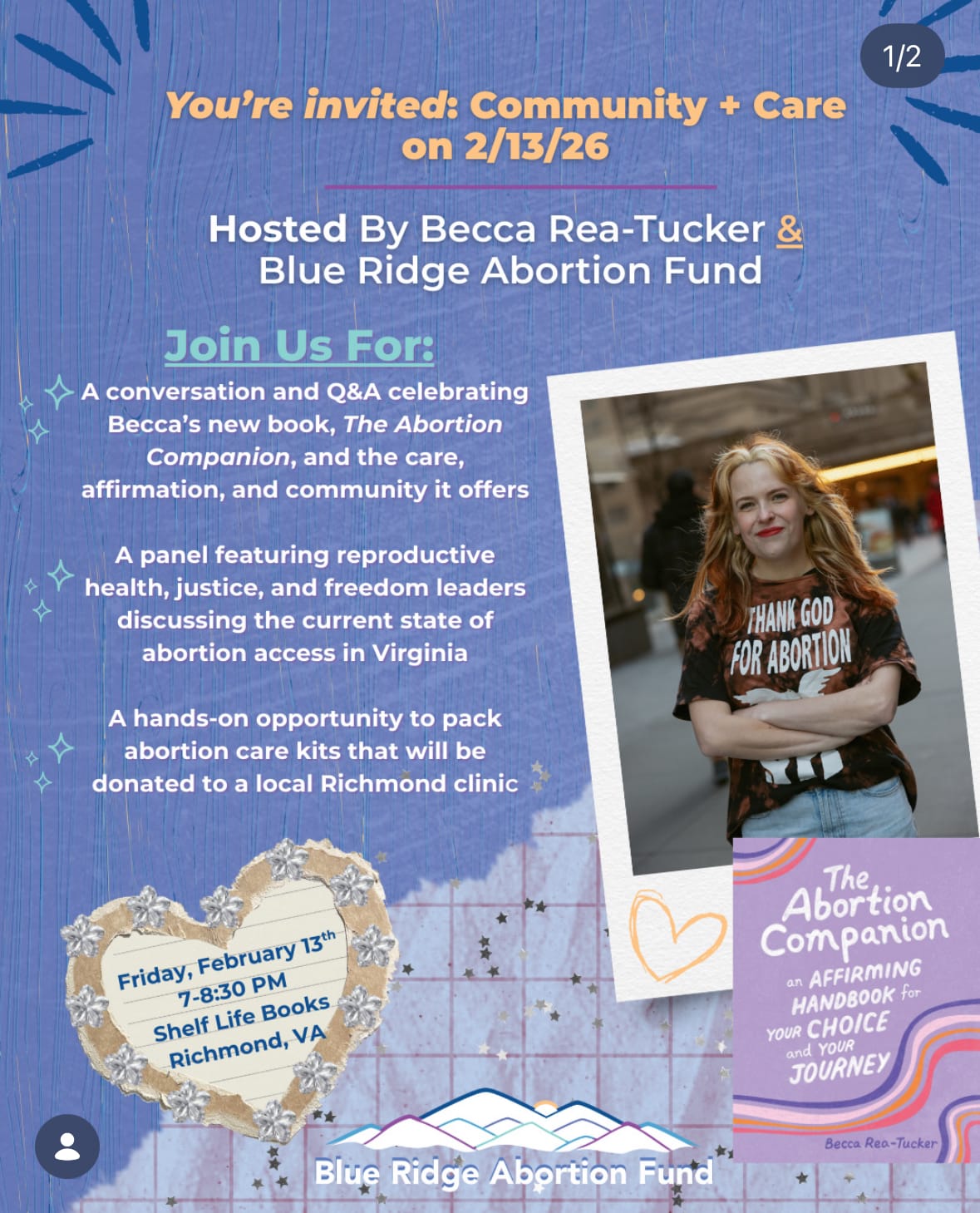 Richmond: Friday 2/13, 7:00-9:00pm at Shelf Life Books, in partnership with Blue Ridge Abortion Fund